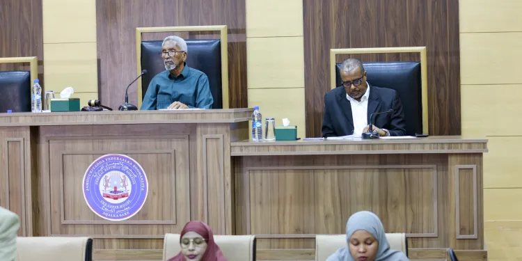 Guddoomiyaha Aqalka Sare ee Baarlamaanka Jamhuuriyadda Federaalka Soomaaliya Mudane Cabdi Xaashi Cabdullaahi oo uu weheliyo Guddoomiye ku xigeenka labaad, Mudane Cabdullaahi Cali Xersi (Timacadde) ayaa maanta shir guddoomiyay kalfadhiga shanaad kulankiis 14-aad oo ajandihiisu ahaa Akhrinta koowaad ee Hindise Sharciyeedka Ilaalinta Xuquuqda Naafada Qaranka Soomaaliyeed.